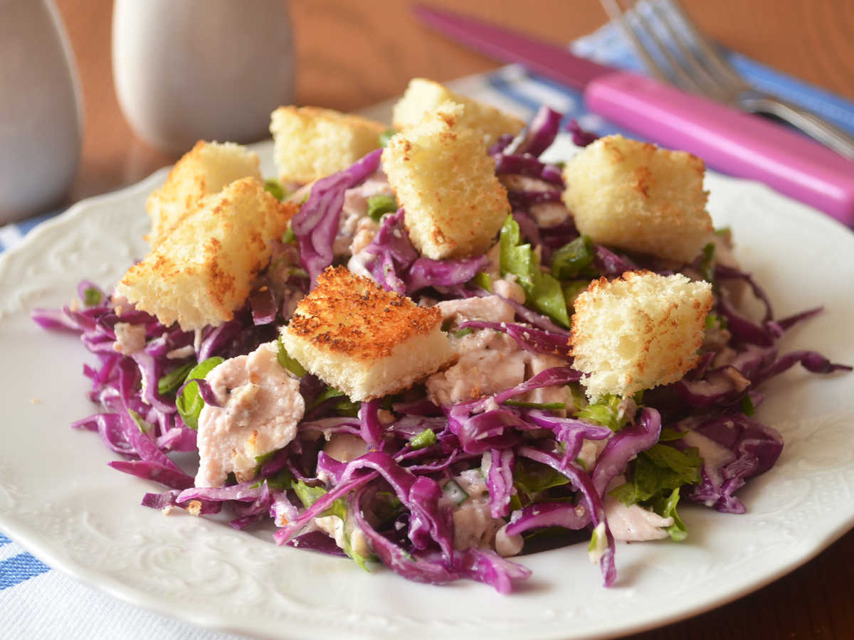 Смешиваем своими силами: капуста и курица, зелень и хрустящие гренки — и за секунды на столе появляется блюдо, которое можно уверенно подать как на обычный вечер, так и на праздничный стол.