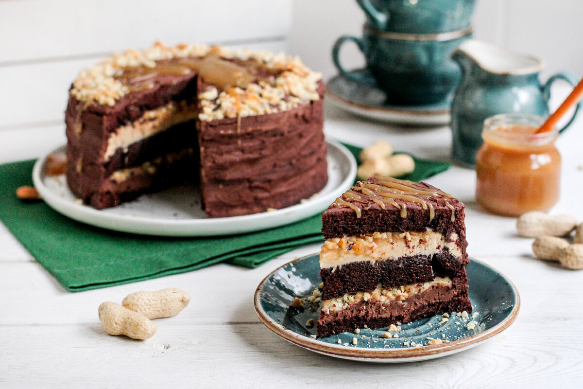 Измельчить арахис в крошку, разрезать бисквит на три коржа. На первом корже распределить часть шоколадного крема, посыпать арахисовой крошкой и залить карамелью. Повторить со вторым коржом и закрыть торт третьим. Обмазать арахисовым кремом и украсить сверху. Убрать в холодильник на 2 часа.