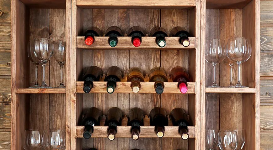 Хранение вино лучше всего организовать в специально отведенных помещениях: коллекционеры часто используют винные погреба или шкафы. Мини-бары и винные стойки также подходят, но их не стоит располагать рядом с источниками тепла, такими как плита или духовка.