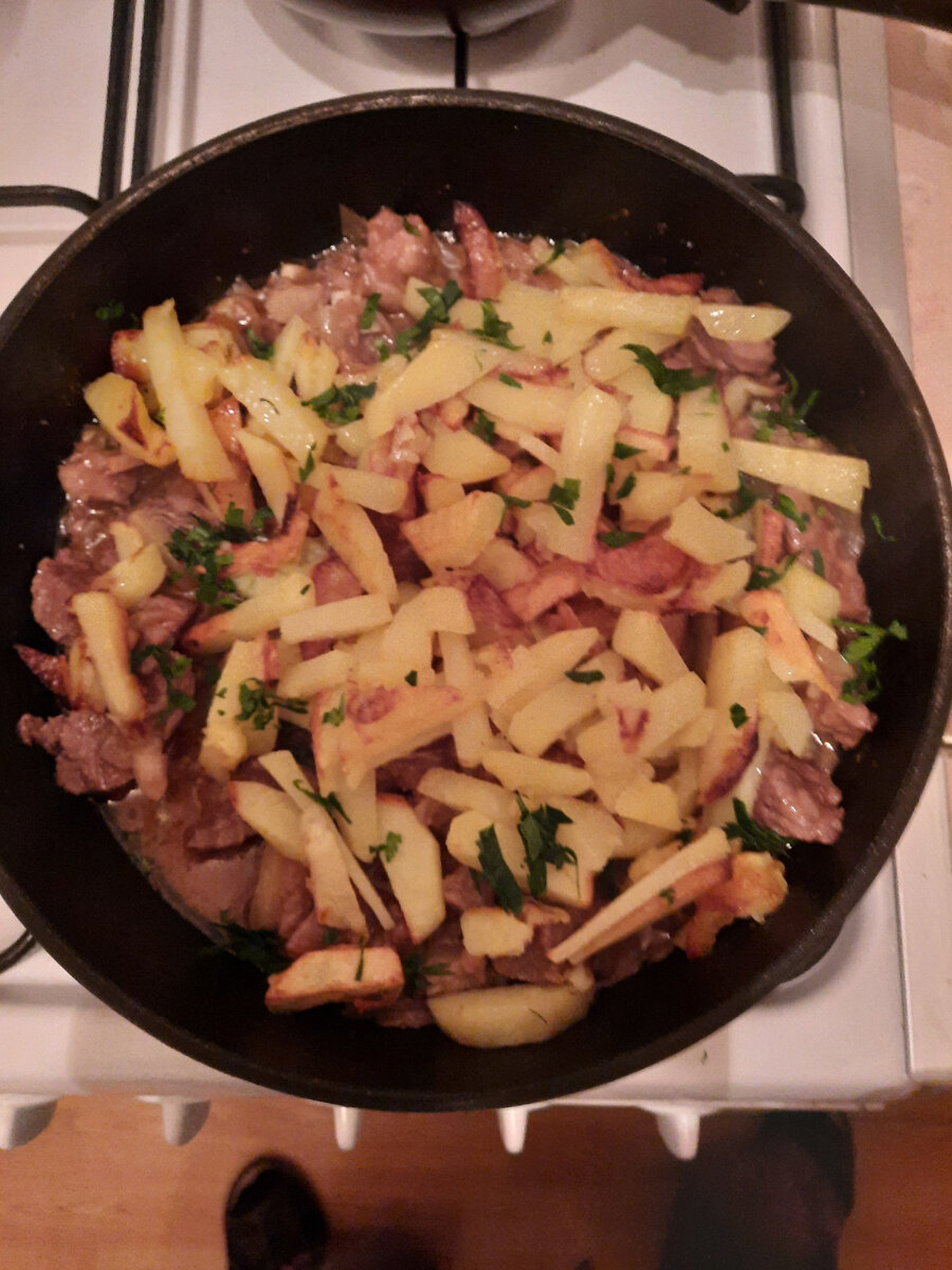 Отдельно поджарьте картошку до золотистой корочки, затем выложите ее на мясо. Накройте сковороду крышкой и прогрейте все вместе. В завершение посыпьте блюдо свежей петрушкой.