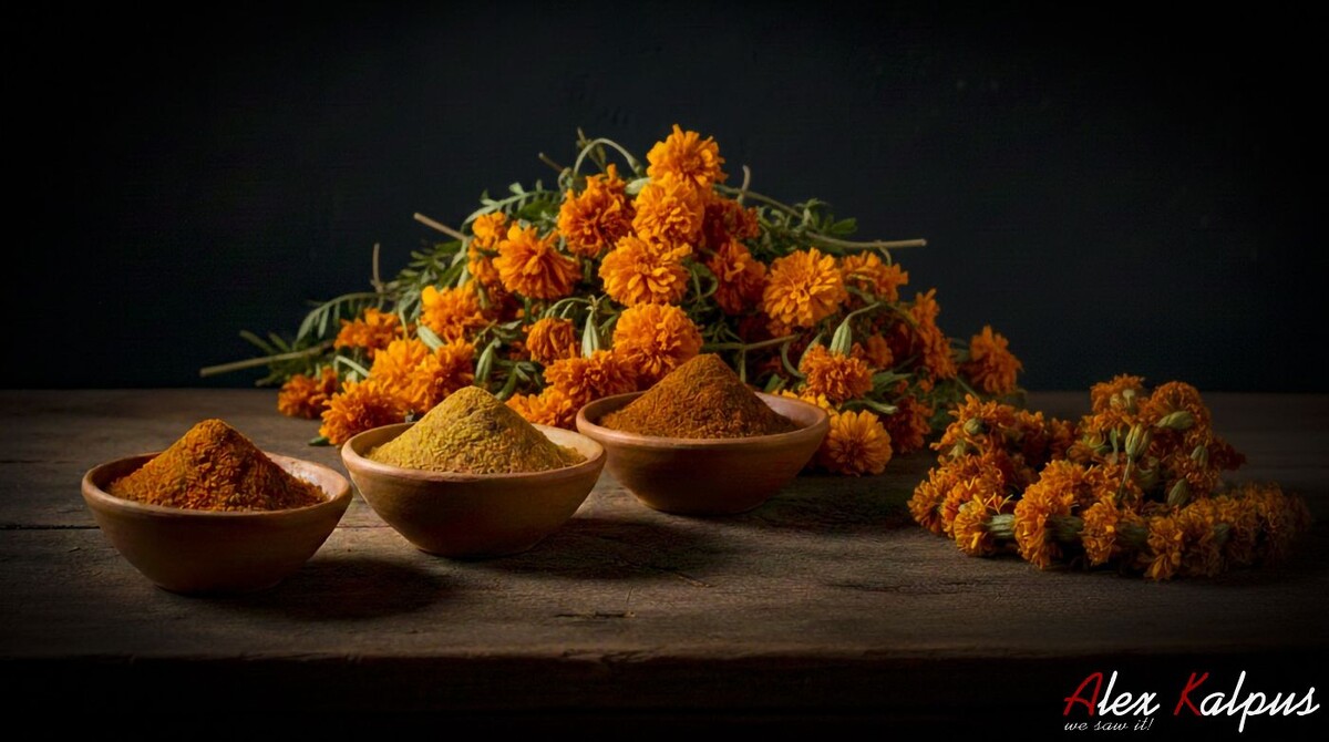 - Tagetes erecta (бархатцы прямостоячие) — благодарю высокому содержанию каротиноидов, обеспечивают насыщенный цвет.