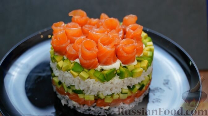 Также можно попробовать слоёный салат "Филадельфия" или ленивые суши, украшенные "розочками" из красной рыбы. Такой салат привнесет атмосферу праздника и станет одним из главных блюд на новогоднем столе!