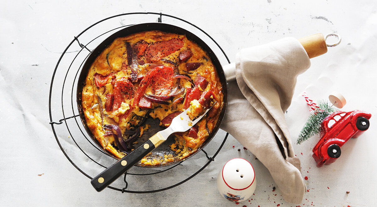 Деревенский омлет с колбасой и помидорами