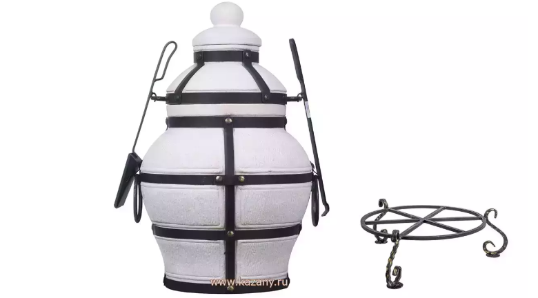 Для растопки понадобится совсем немного дров, а в комплект входят 6 шампуров длиной 42 сантиметра и устройство для подвеса. Кроме того, поставляются совок и кочерга. Удобно, что этот тандыр установлен на кованые ножки, что исключает необходимость дополнительной подставки. Диаметр горловины составляет 21 сантиметр, что делает его подходящим для шашлыка, но не для более крупных блюд.