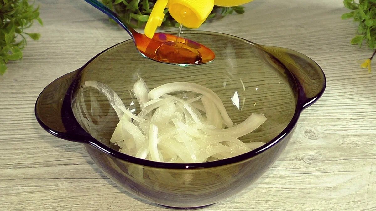 Начать стоит с подготовки лука. Его нарезают тонкими перьями и помещают в отдельную миску. К луку добавляется щепотка соли, половина чайной ложки сахара, чайная ложка лимонного сока и растительное масло. Все ингредиенты необходимо тщательно перемешать и оставить на 10 минут, чтобы лук промариновался.