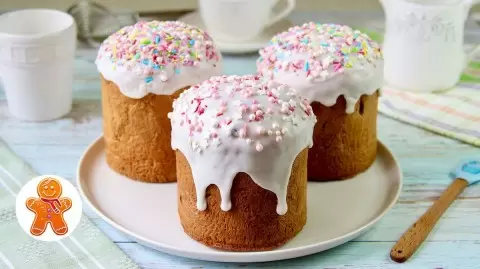 Как только куличи остынут, пробейте в верхушке несколько неглубоких проколов и пропитайте сиропом. В завершение украсьте глазурью и цветной посыпкой.