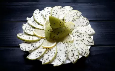 Для её приготовления не потребуется много времени и сложных действий. После нарезки яблок, их помещают в миску, добавляют сок половины лимона, сушеную мяту и небольшое количество соли. Все ингредиенты хорошо перемешиваются, и закуска готова к подаче на стол. Чтобы сделать её презентабельнее, можно украсить дольками лимона.