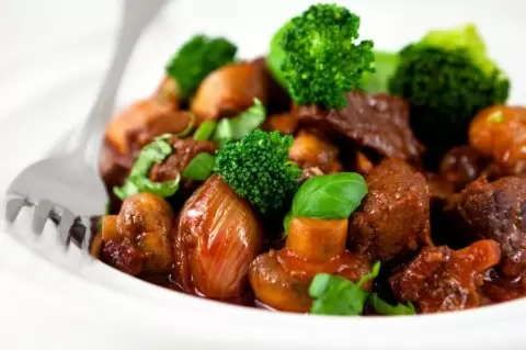 Затем заливаем все красным вином так, чтобы уровень жидкости покрывал продукты наполовину. В случае нехватки вина можно добавить немного воды или бульона. Доведите до кипения, накройте крышкой и готовьте на среднем огне 10 минут. После этого убавьте огонь до минимального и тушите еще 50 минут. Ваше блюдо будет готово, как только время выйдет!