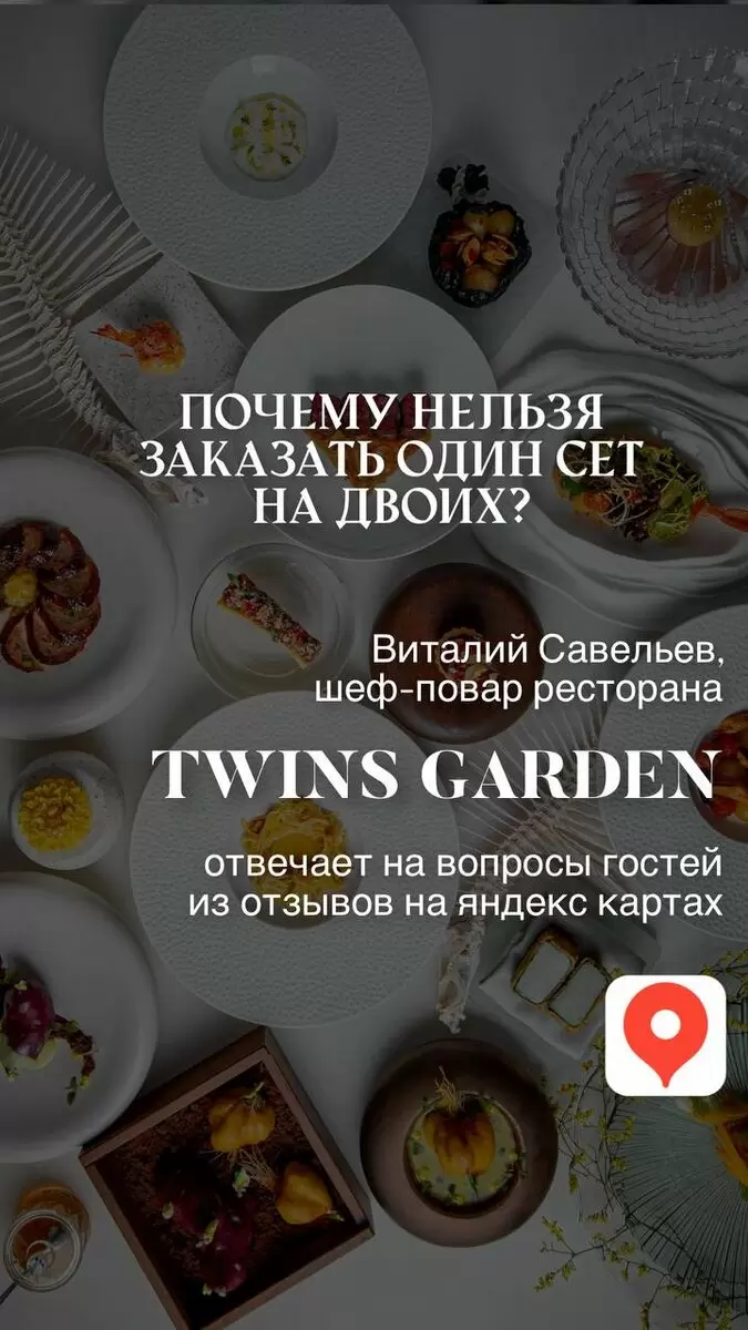 Вопрос, который вызывает множество споров среди клиентов ресторанов: «Почему нельзя заказать один сет на двоих?» Популярный шеф-повар ресторана Twins Garden Виталий Савельев отвечает на этот и другие животрепещущие вопросы гостей в новой серии видео на платформе Яндекс Карты.