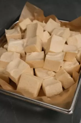 4. Формовка пастилы: Подготовьте подходящую форму, желательно 14х14 см, и выстелите ее пищевой пленкой. Перелейте взбитую массу в форму и разровняйте верх. Уберите десерт в холодильник на несколько часов для полной стабилизации.