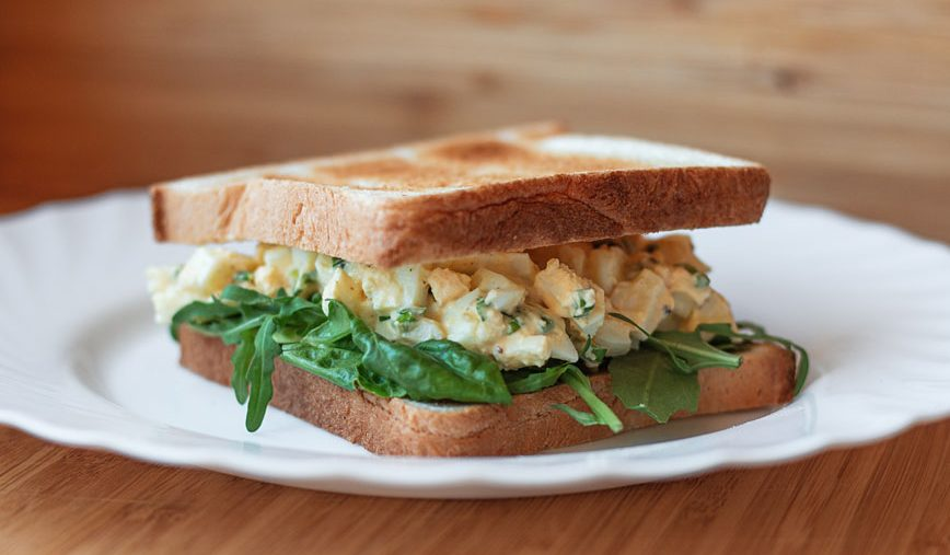 Шаг 3: Подсушите ломтики хлеба в тостере или на сковороде и на один из них выложите приготовленный яичный салат. Если хочется, сверху можно добавить лист салата. Накройте вторым ломтиком хлеба и слегка прижмите. Для удобства можно разрезать сэндвич по диагонали.