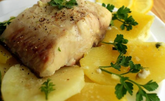Сначала картофель очистить, нарезать тонкими ломтиками и слегка обжарить на сковороде до золотистого цвета. Для рыбы убрать чешую и кости, а затем нарезать филе небольшими кусочками. Лук следует нашинковать кольцами и также немного обжарить до мягкости.