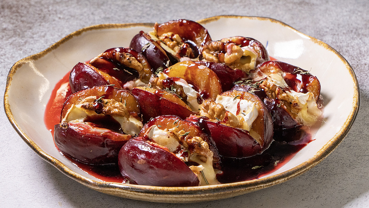 Для начала необходимо аккуратно извлечь косточки из слив, сохраняя их форму. Затем каждую половинку нужно начинить ядром грецкого ореха и небольшим кусочком сыра камамбера. Если хочется добавить немного остроты, в начинку можно включить и халапеньо. Выложить подготовленные сливы на противень, застеленный пергаментом, так чтобы начинка оказалась сверху. Сверху полить каплей меда и оливкового масла.