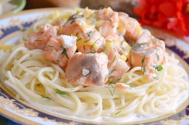 Готовые макароны можно смешать с семгой и соусом, или выложить рыбу поверх макарон и щедро полить соусом.