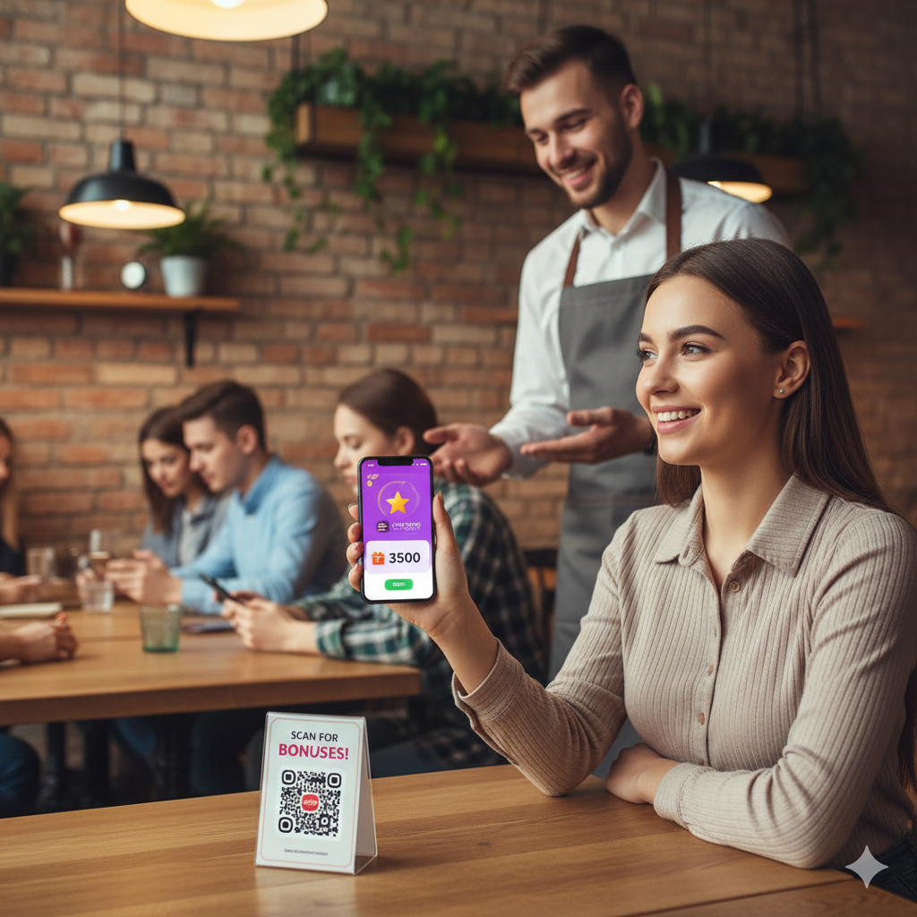 - Посетитель сканирует QR-код на столе или чеке, где может найти свой заказ и получить бонус через подписку на рассылку.