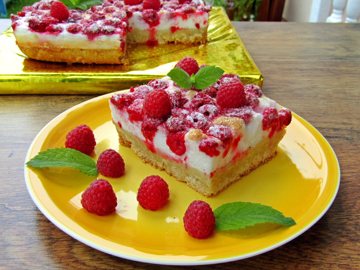 Малину обвалять в крахмале, аккуратно перемешать и отложить в сторону. Когда тесто будет готово, на него равномерно распределить меренгу, сверху выложить малину. Вернуть пирог в духовку еще на 25 минут.