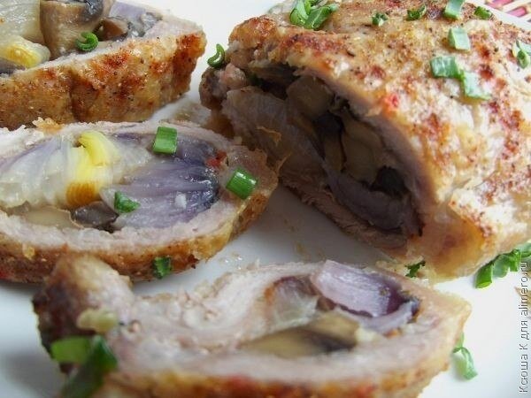 4. Формирование кармашков: В каждом куске мяса сделать надрез, образующий карман. Мясо посолить, поперчить и приправить специями. Вложить в карман обжаренные луковые кольца и грибы, затем закрыть кармашек и закрепить края зубочистками.