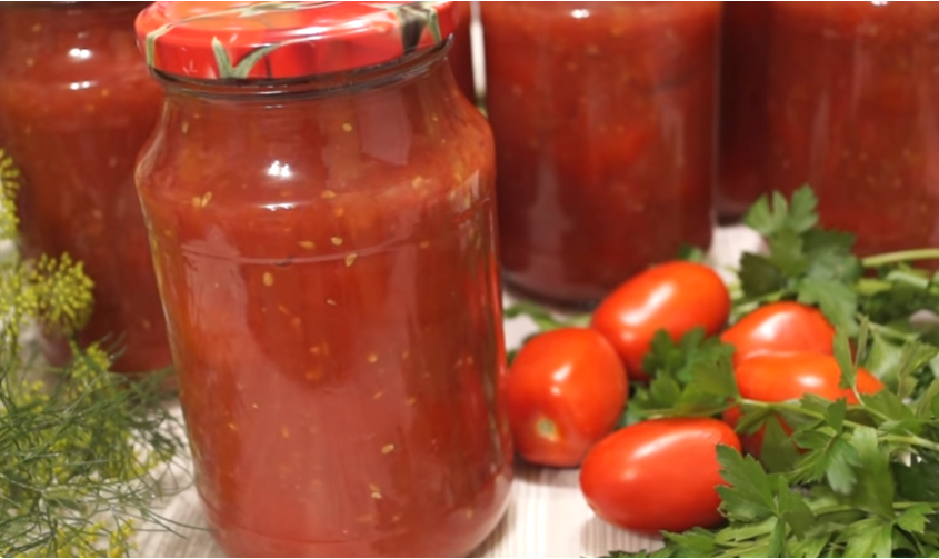 Приготовление: Отобрать крепкие томаты для укладки в банки. Сначала уложить их и залить крутым кипятком, прикрыв крышками, чтобы они прогрелись. Затем сделать заливку из размитых переспевших помидоров. После того как томаты настоятся, слить воду и залить готовой заливкой. Укупорить банки. Оставить остывать под одеялом.