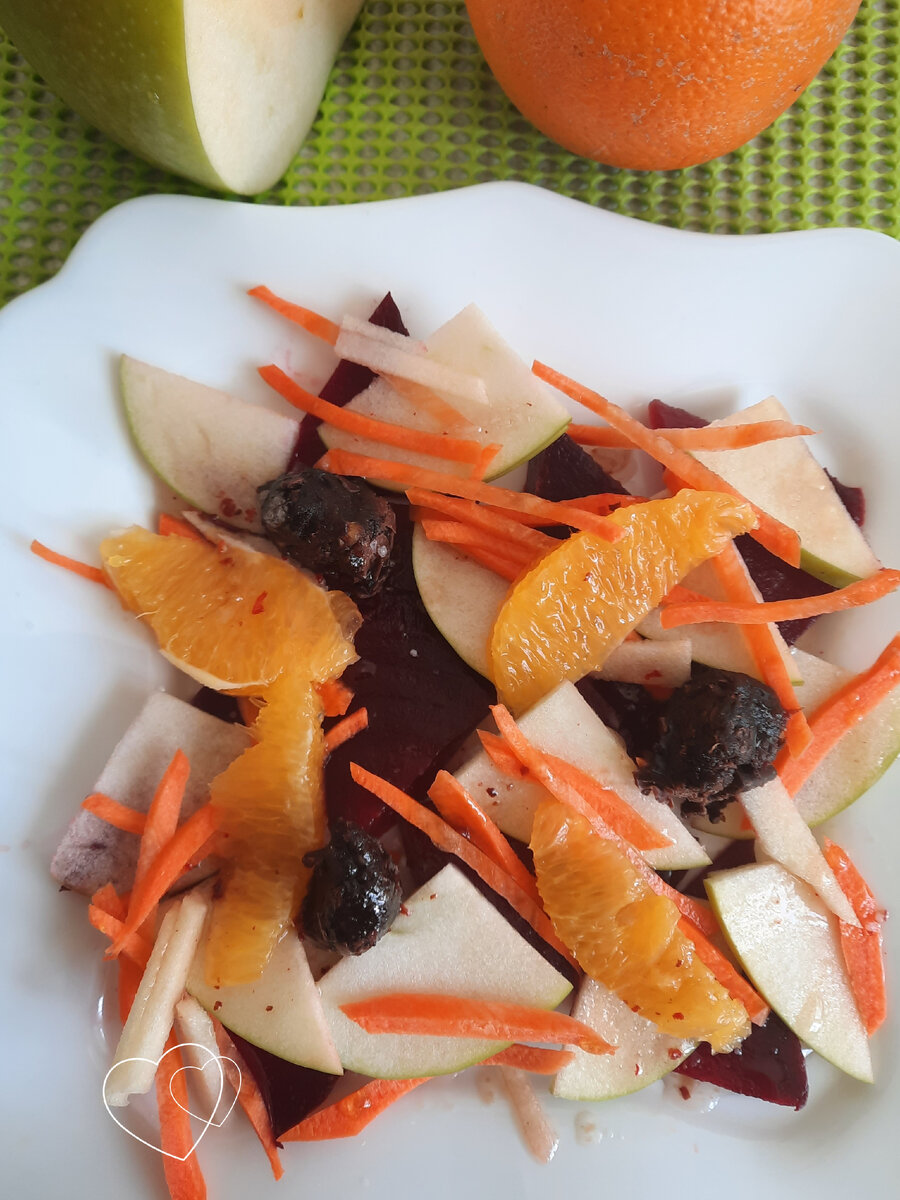 Заправить салат растительным маслом. Сочетание сладкой свеклы, кислого яблока и цитрусового аромата придаст блюду необыкновенный вкус с яркой кисло-сладкой нотой.