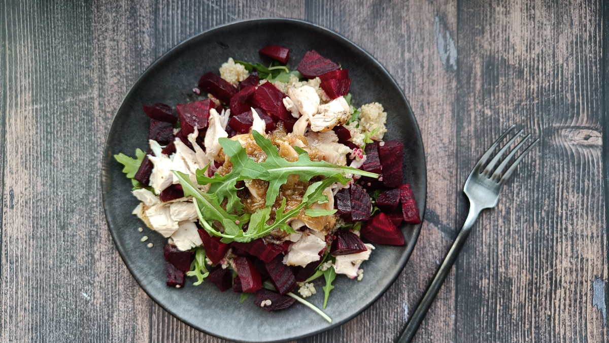 Этот салат, который сочетает в себе киноа, курицу, свёклу и руколу, долго ждал своего момента. Все началось в мае, когда в семье решили провести отпуск, чтобы больше времени уделить кулинарным увлечениям. Однако вместо кулинарных экспериментов семья просто наблюдала за шоу «Молодые ножи. Новая кровь», где молодые повара учатся готовить на наших глазах. Это вдохновило не только их, но и самого мужа, который придумал оригинальный рецепт куриных голеней с творожной начинкой. Идея была замечательной, но из-за бытовой суеты она немного подзабылась.