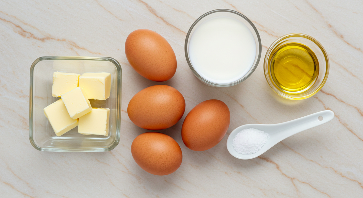 - Яйца — 4 шт.: Используйте яйца комнатной температуры — они лучше смешиваются и придают омлету нежную текстуру.