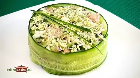 После того как все тщательно перемешано, салат можно укладывать в сервиционное кольцо, утрамбовать и аккуратно снять кольцо. Бока можно украсить слайсами огурца, которые легко нарезать с помощью овощечистки. Завершить оформление можно зеленью или тертым желтком для яркости и аппетитности. Это простой, но очень эффектный салат, который завершит любую трапезу!