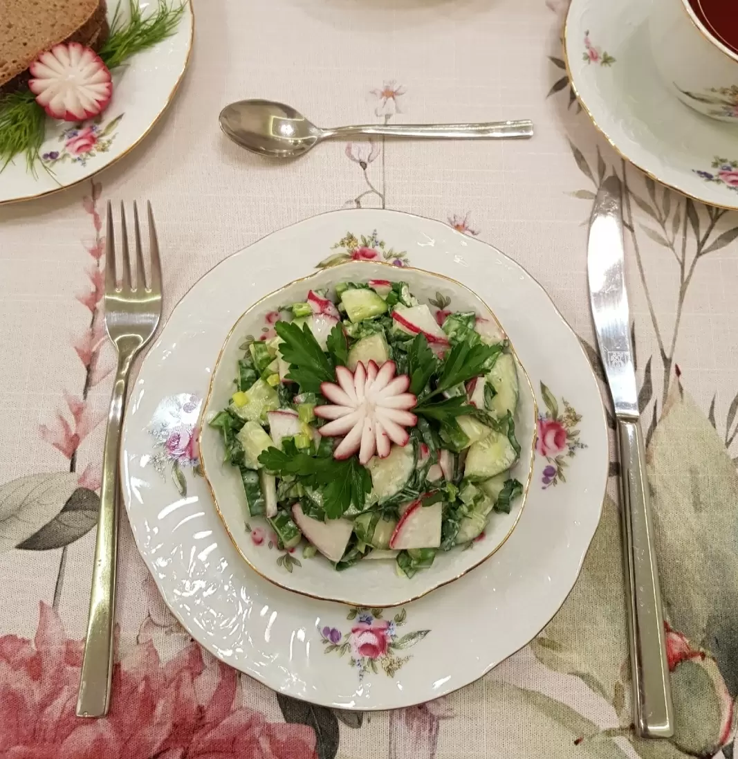 После того как салат тщательно перемешан, его можно разложить по порционным тарелкам. Для эффектного оформления используются цветы из редиса и свежие листья петрушки, что не только украсит блюдо, но и добавит нотки весны. Наслаждайтесь этой яркой закуской, которая подарит легкость и свежесть в любой обед или вечернюю встречу.