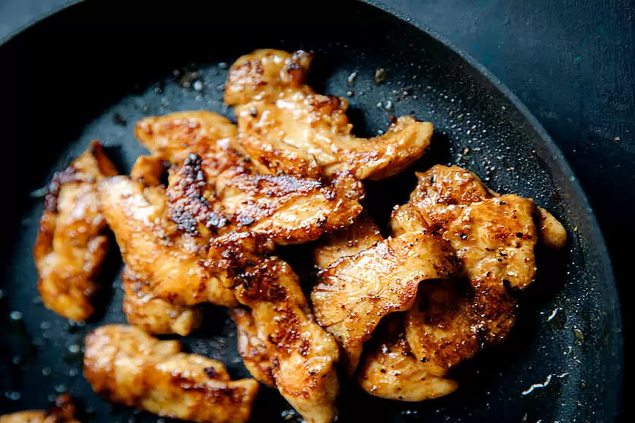 Куриное филе нарезать на небольшие кусочки, поместить в миску. Добавить все ингредиенты для маринада, тщательно перемешать и оставить на 20 минут для пропитывания.Разогреть сковороду на среднем огне, налить растительное масло. Выложить курицу в один слой и обжаривать до появления золотистой корочки с одной стороны (примерно 2 минуты). Перевернуть и дожарить до готовности с другой стороны, присыпав молотым черным перцем. Блюдо готово!Подавать на листьях салата с нарезанным огурцом и морковью.