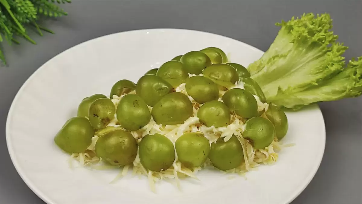 При укладке салата на блюдо следует чередовать слои: начинать с куриного филе, добавлять майонез, яйцо, затем сыр и финальный штрих — виноград. Очень важно не переборщить с майонезом, чтобы сохранить лёгкость блюда.