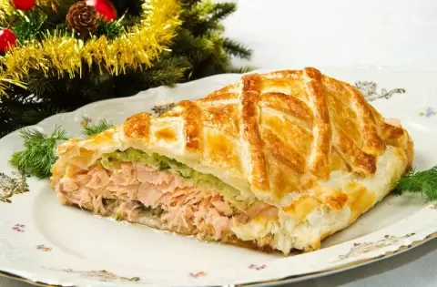 Разогрейте духовку до 180 градусов. Раскатайте слоеное тесто в прямоугольник, ориентируйтесь по размеру рыбы.