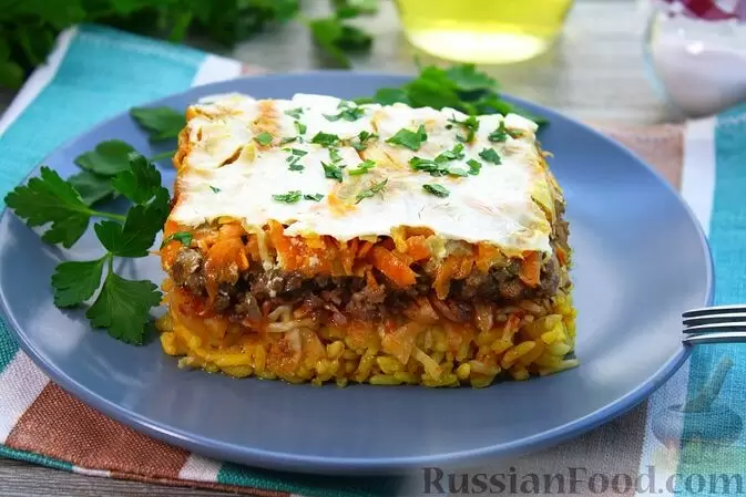 - Запеканка с рисом, капустой и фаршем: это блюдо напоминает традиционные голубцы, сочетающее в себе отварной рис, свежую капусту и мясной фарш, заботливо уложенные слоями.