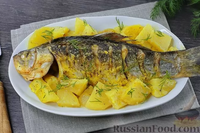 - Караси с картошкой в майонезно-чесночном соусе — этот пикантный и сытный вариант радует сочетанием нежного филе и аппетитного картофеля. Блюдо запекается в ароматной оболочке, что обеспечивает его удивительный вкус.