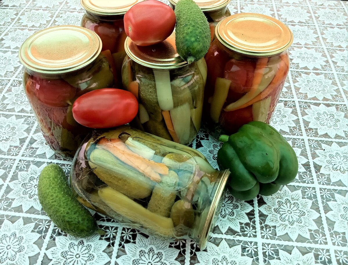Для начала, банки стоят на столе, а на кухне вовсю шумит приготовление. В банки укладываются овощи: огурцы, томаты, перцы и морковь, нарезанные на небольшие кусочки. Чеснок, укроп и листья хрена также добавляют для аромата. Вскипятите воду и залейте ей банки, оставив на 20-30 минут. Это позволит овощам немного обработаться горячей водой и настояться.