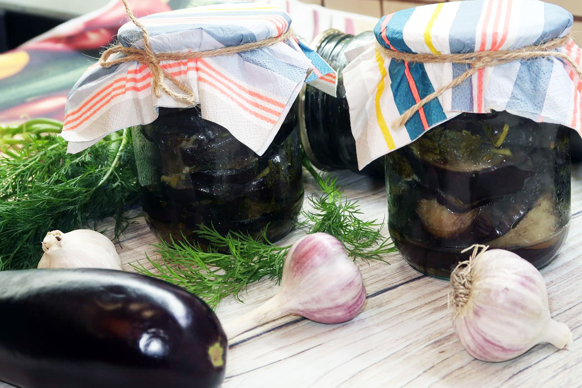 Перед укладкой баклажанов в банки, на дно каждой контейнера нужно добавить немного приготовленной смеси из зелени и чеснока. Затем положите слой жареных баклажанов, не забыв снова добавить зелень. Повторяйте процесс, пока банка не заполнится. В конце добавьте 1 ст. л. уксуса. Окончательно закройте банки стерилизованными крышками, поместив их в кастрюлю на дно которой укладывается ткань. Наполните кастрюлю холодной водой и доведите до кипения, затем стерилизуйте на малом огне в течение 20-30 минут.