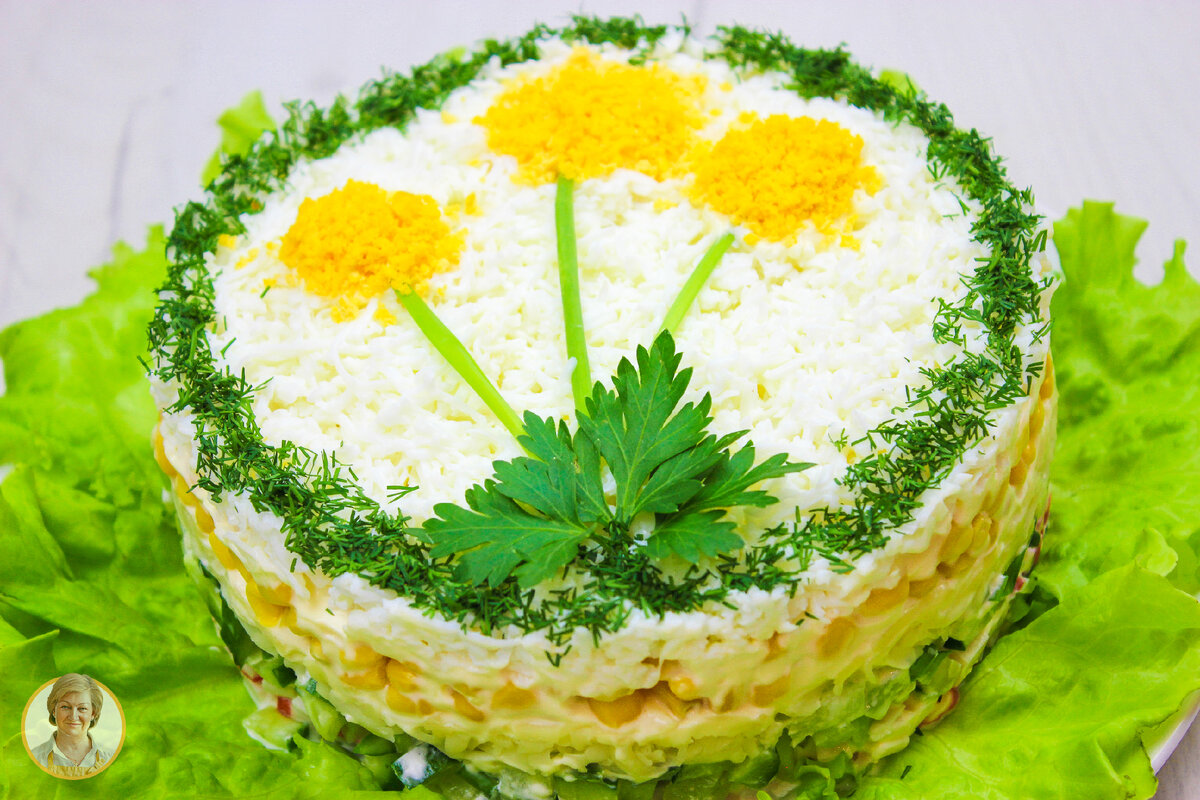 Салат "Одуванчик" готов, и он станет настоящим украшением вашего стола! Приятного аппетита!