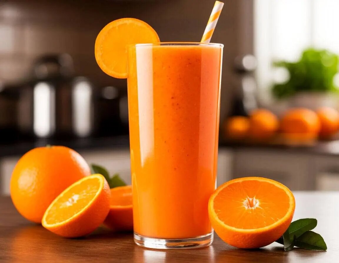 Очистить и нарезать все ингредиенты, затем измельчить в блендере. Этот смузи подарит ощущение солнечного денька, даже если за окном дождь.