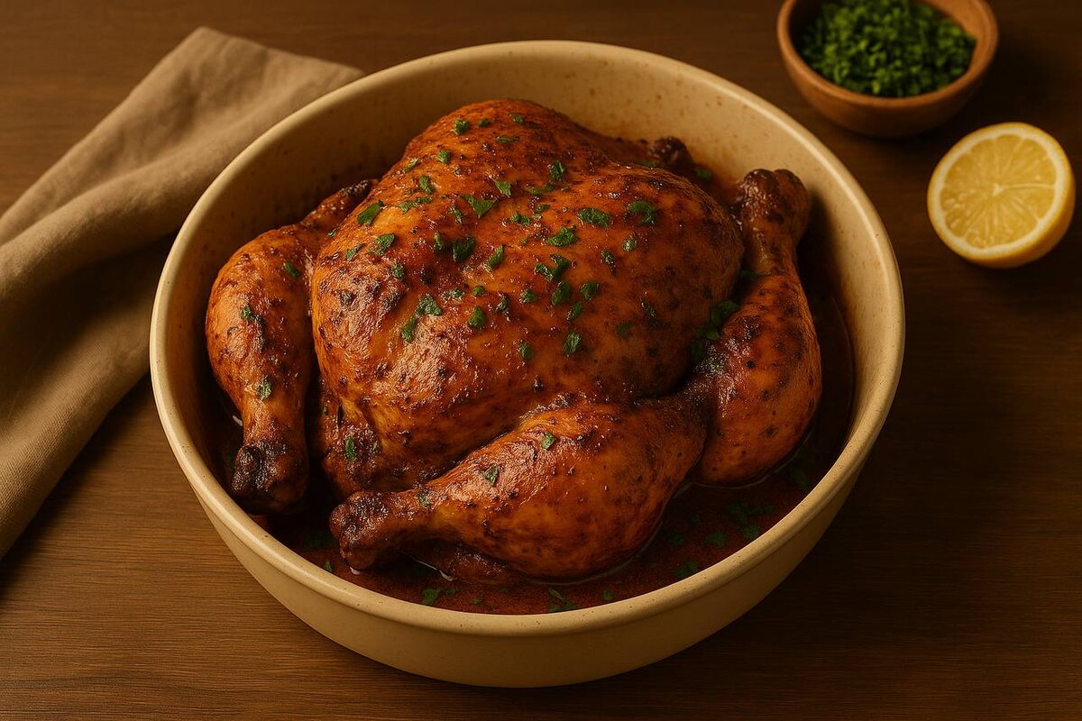 Для запекания лучше использовать обычную форму, накрытую фольгой или крышкой. Это позволяет сохранить соки и ароматы. После маринования достаточно запекать курицу в духовке при 180–190 градусах около 40–50 минут, а в конце это можно сделать без фольги для получения румяной корочки.